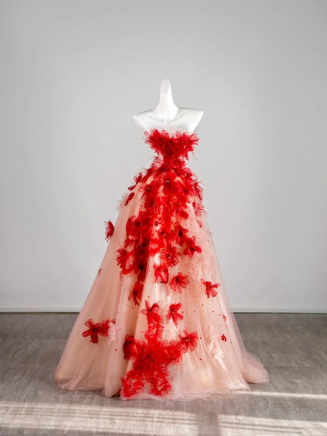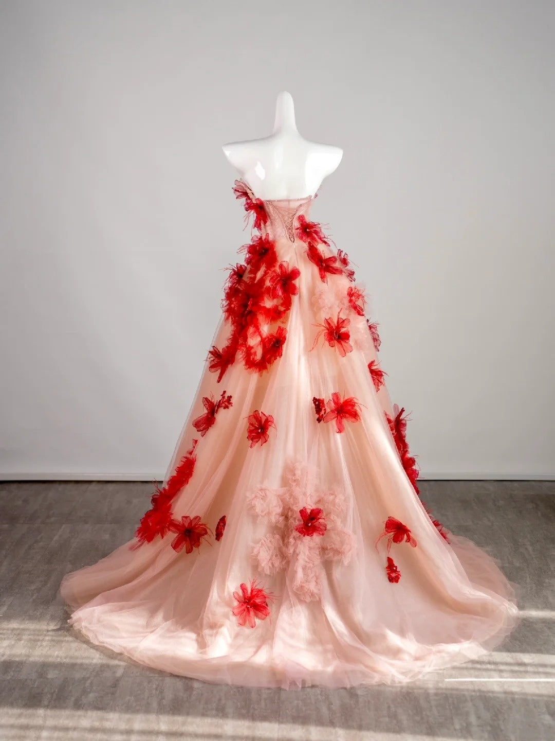 Cute Ball Gown Strapless Red Floral Sleeveless With Applique Pink Tulle Long Quinceanera Dresses Sweet 15 16 Birthday Outfit HZ0311