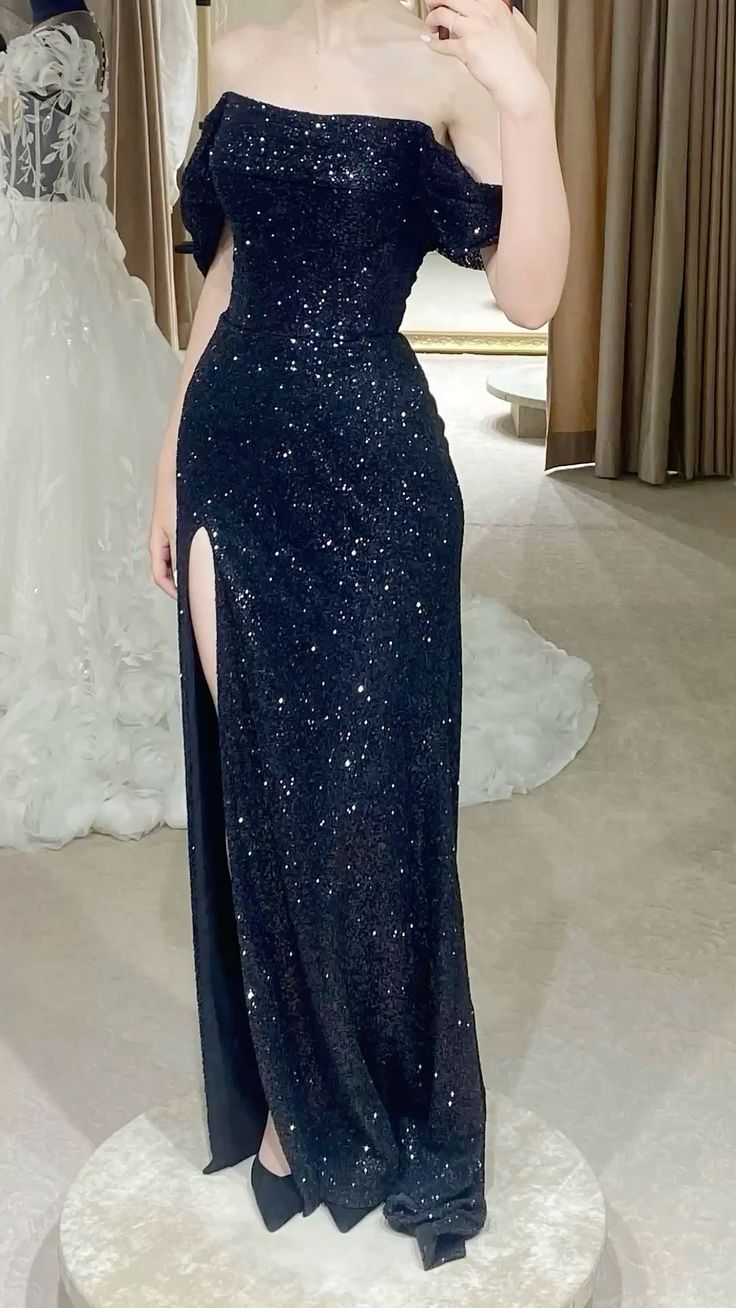 Chic Mermaid Off The Shoulder Navy Blue Sequins Slit With Pleated Short Sleeves Long Party Women Prom Dresses HZ0311