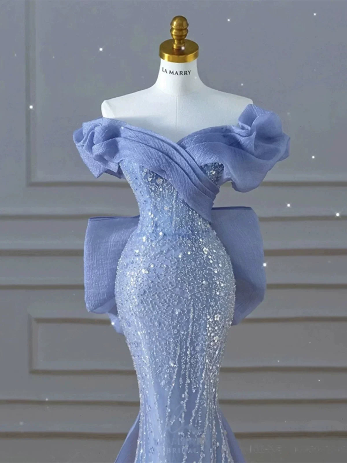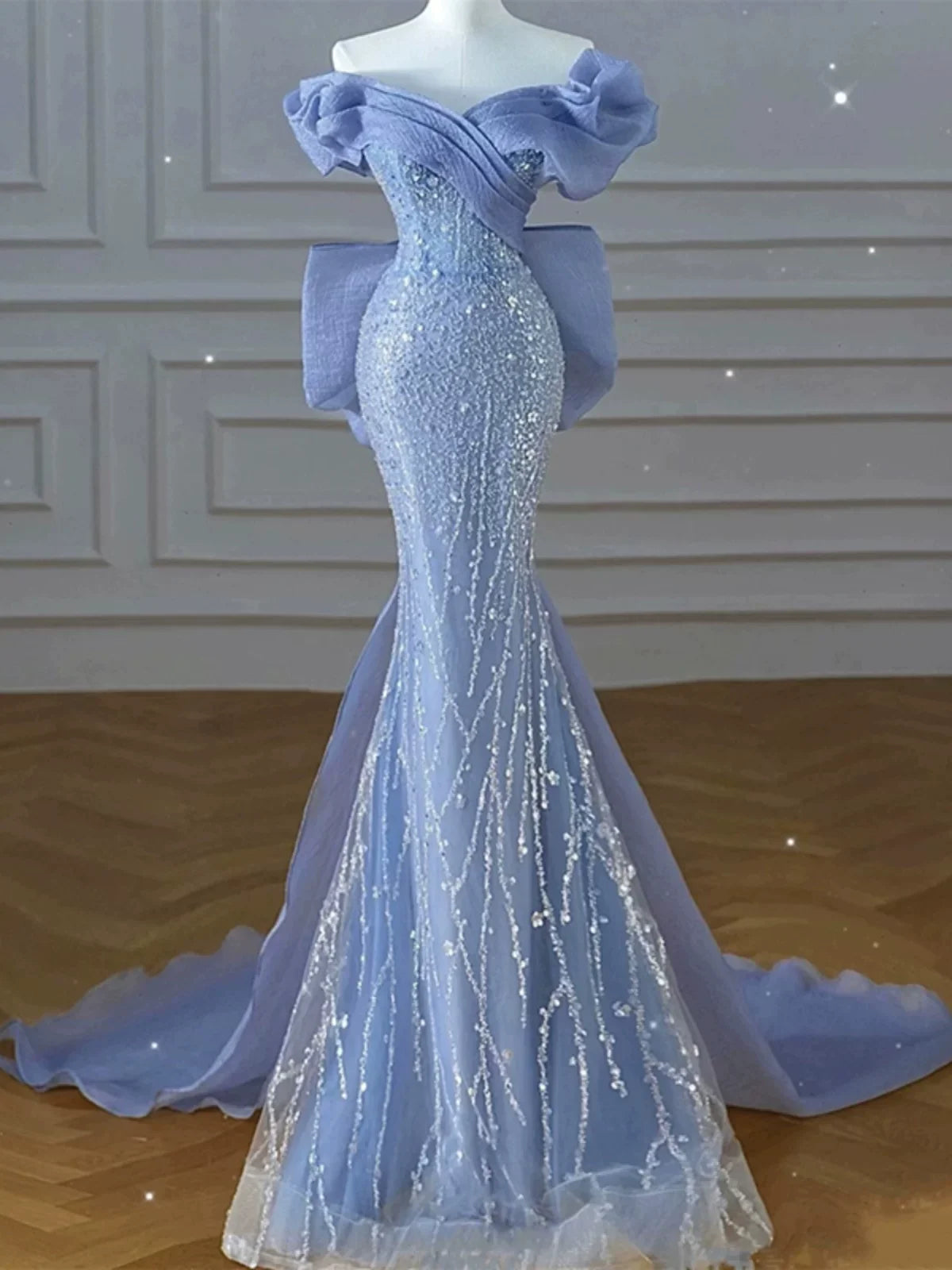 Modest Prom Dresses Aesthetic Mermaid Off The Shoulder Blue Inspiration Style Impress With Short Sleeves Long Party Formal Gown HZ0311
