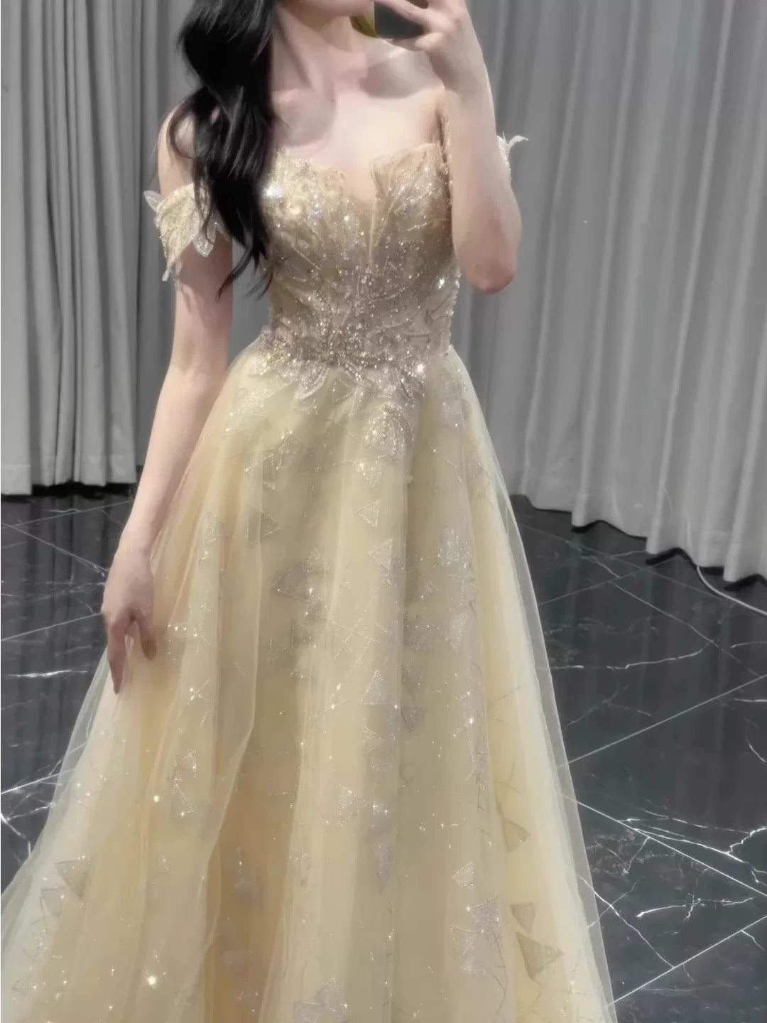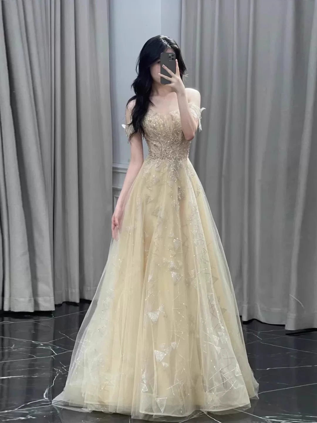 Unique A line Off The Shoulder Gold With Short Sleeves Prom Dresses Inspiration Party Night Gowns 20th Birthday Outfits HZ0311